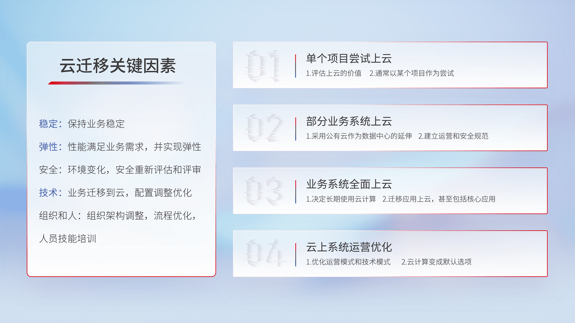 结合实际业务,,,,从规划设计、、、、云平台选型、、、、云原生改造、、、、数据迁移、、、集成交付,,迁移全过程为客户识别最佳上云路径,,,,做好风险识别管理,,,,设计网络架构、、、身份权限、、、安全审计合规、、、操作审计、、、日志审计、、、、监控告警策略、、、、多站点容灾设计等,,,,对云上基础设施进行整体规划,,,提升IT治理水平,,,,以满足弹性、、、、高可用、、、高性能的需求。。。