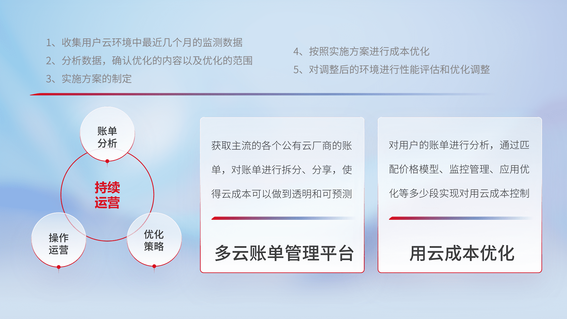 通过多云纳管,,,以统一的资源数据模型把客户的云资源进行抽象和封装,,,进而实现对多云资源的统一操作,,保障云资源管理的可靠性、、、、稳定性与可用性。。。。量身定制化运维内容,,,,配置、、、、开发运维、、、补丁管理、、、、备份、、监控、、、、认证和访问管理、、、审计和日常巡检等,,,,保障在用云过程中的可靠度,,稳定度以及高可用率。。。